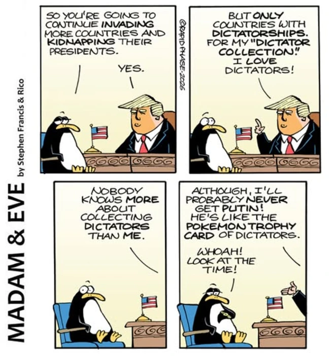 Skip to commentsMadam & Eve has been having fun with Trump’s expansionist ambitions, and why not? As noted before, they have no oil for him to covet and, thanks to his gullible acceptance of toxic, one-sided fables, he’s opened the door to accept a group of faux-refugees that will relieve South Africa of their whinging.