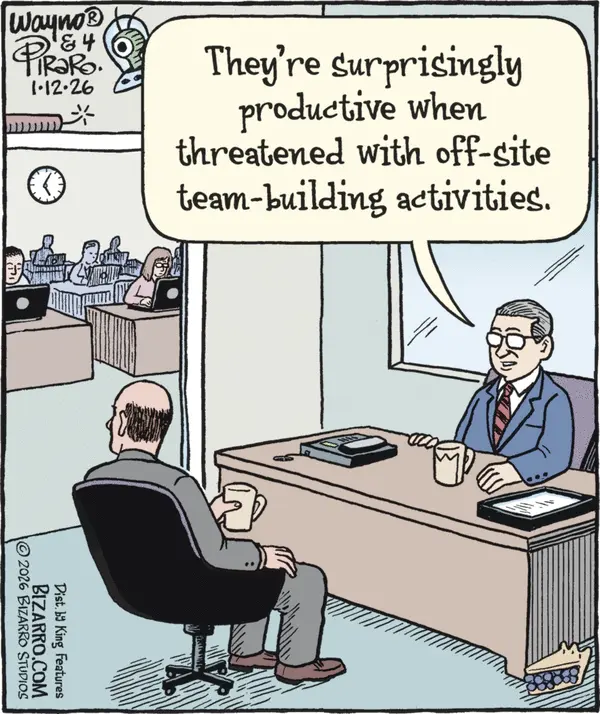 And so I disagree with Bizarro, because people can only hide by keeping their noses to the grindstone for so long, and the real value of staging those fun, mandatory team-building exercises is maintaining staff turnover so you can keep a large proportion of your workforce on entry-level wages.