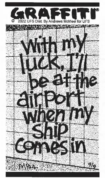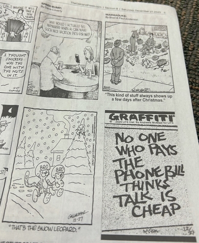 Skip to commentsAndrews McMeel Syndication (AMS) has dropped the comic quip panel Graffiti from its list of syndicated features recently (the past few days). It may have been dropped from the GoComics roster last month. A Google search has The Chicago Tribune GoComics portal showing it for Saturday December 27, 2025.