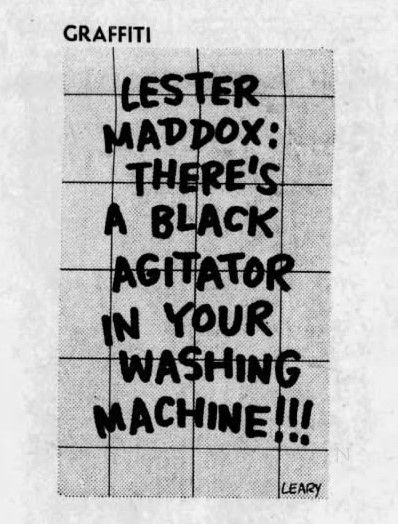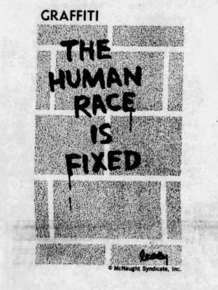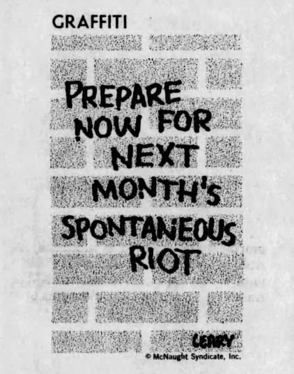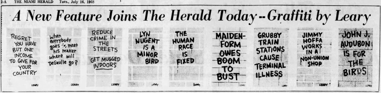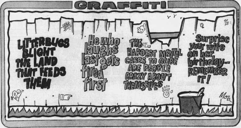The one column newspaper panel featuring witty one-liners scrawled on a brick wall was created by Bill Leary and first appeared July 1, 1968 (in The Frankfort State Journal above). Leary was not adverse to throwing in jibes at the politics of the day and some of the epigrams are pertinent to today’s circumstances.