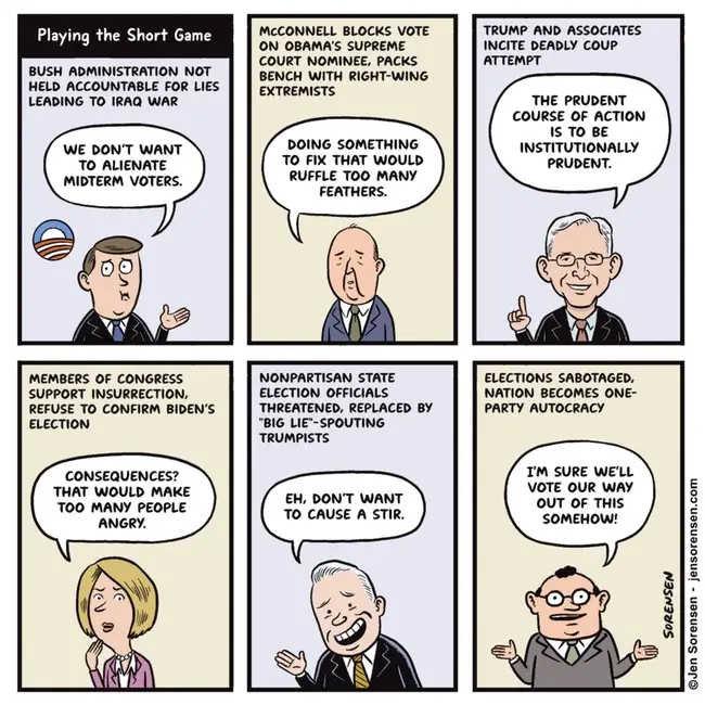 Or maybe we never had either common sense or a whole lot of courage. Sorensen goes back in time to point out how we have arrived at this spot through a concerted effort to avoid doing anything that might seem at all dynamic.