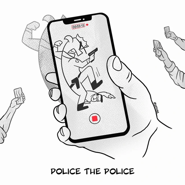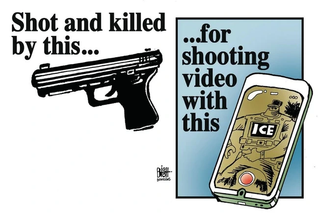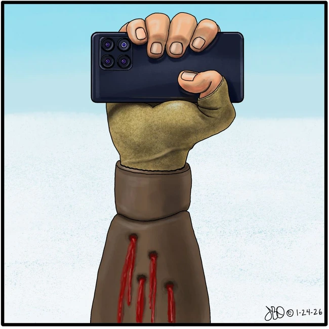 Vaz offers a more cartoonish image, while making a play on words, then buttresses the statement by adding several phones beyond the one at center, and I’d note that he’s not depicting Pretti’s phone but someone taping the assault, which brings us back to Pett’s statement and Walz’s advice about collecting evidence.