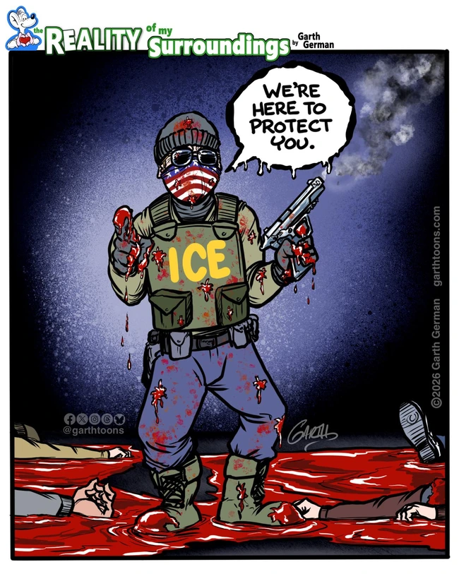 Having seen plenty of German’s cartoons, I know he’s being ironic here and suggests that ICE is more of a danger than a protector.