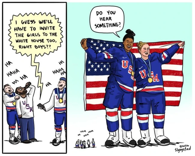 Not all women are as readily victimized as poor Ingrid Bergman. Slyngstad points out how Dear Leader complimented the Gold Medal Olympic Men’s Hockey Team with a White House invitation, then threw some sexist mud at the Gold Medal Olympic Women’s Hockey Team with a snotty remark that he guessed he’d have to invite them, too.