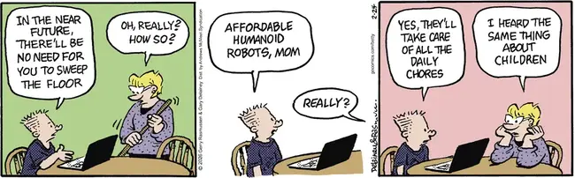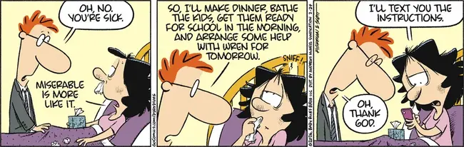 Baby Blues is in a story arc that I think goes back to the stone age. There’s a familiar old story of the husband and wife changing jobs, common enough to qualify as folktale category #1408. It’s always the husband who screws up, most likely because women were occasionally called upon to help in the fields and so knew the job, even if it wasn’t theirs.