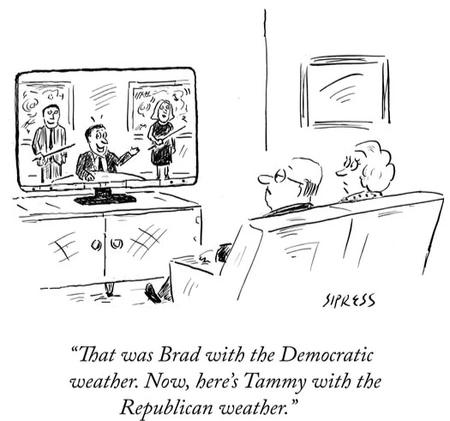Sipress examines efforts to be fair. The problem with being fair is that you become somewhat like instant oatmeal: Bland and boring. But we already see attempts in the weather, because they’ll cheerfully announce an upcoming week of sunny weather and then admit that we could really use some rain.