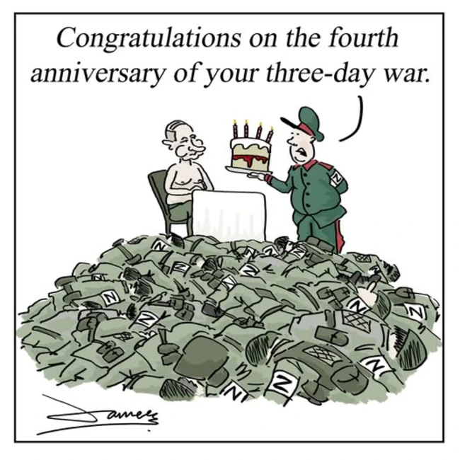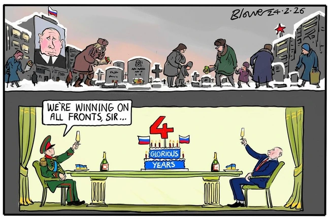 We’re not the only country where cheery optimism ignores obvious realities. Note that, in the upper image of mourners, the Red Star and portrait of Putin indicate that Blower is pointing out the sacrifices of the Russian people, not the Ukrainians, and contrasting it with the lack of sacrifice from those who live immune inside a rich cocoon.