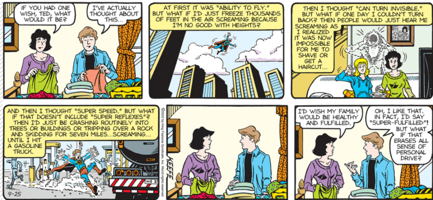 Q: You’ve been the illustrator for Sally Forth since 2013. For the comic strip, you supply the art, lettering and color guides. Francesco Marciuliano is the writer. Can you please describe the creative process between the two of you.