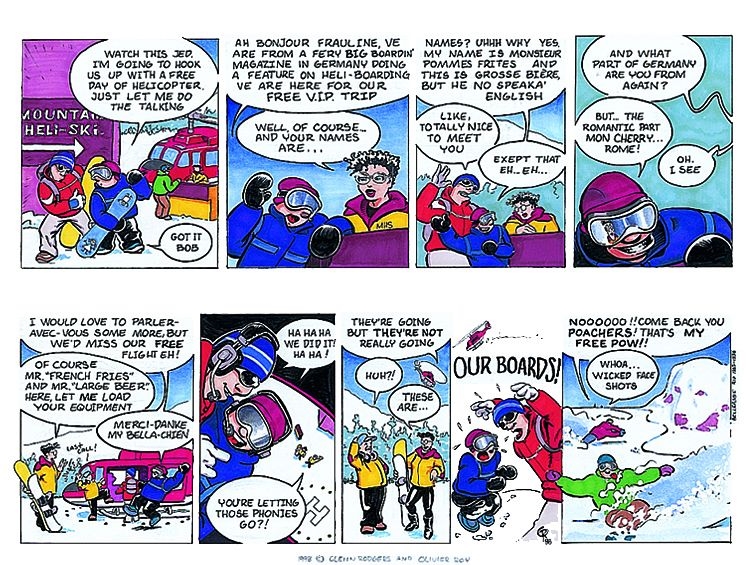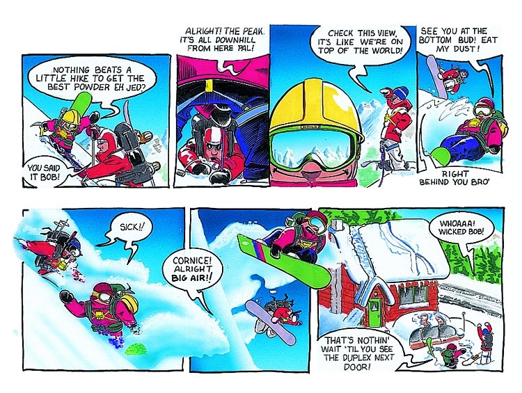Roy collaborated with local Glenn Rogers – known for his comic panels in The Whistler Question (a former, local publication started in 1976) – to produce the strip. The two worked together for eight years (“if I remember correctly”, states Roy), producing the 8 panel, 2 row, half-page ‘Boarder Bob’ strip. Published four times a year, “we had a lot of fun” poking fun at the “life of snowboarding in Whistler and on the West Coast.”
