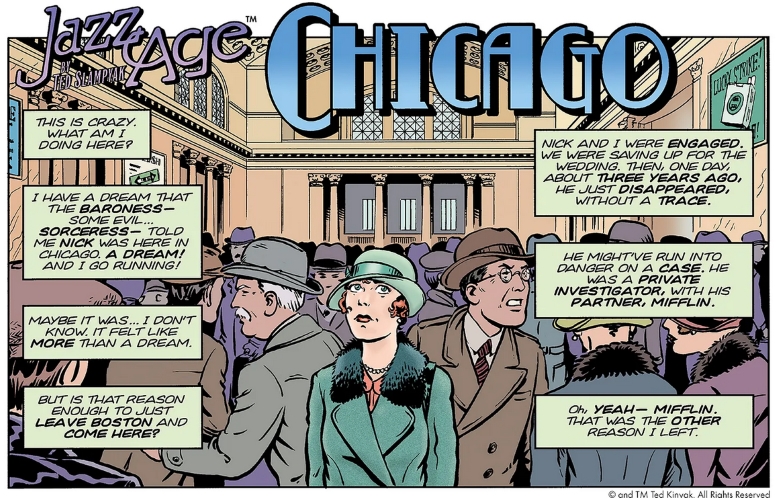 Born in 1965 in Philadelphia, he graduated from Temple University’s Tyler School of Art in 1987. Soon after, he created the comic series Jazz Age Chronicles, a period adventure mix of magic and detectives set in the 1920s–1930s, which originally ran from around 1988 to 1992 from EF Graphics and Caliber Comics, inspired by the role-playing game Call of Cthulhu. He revived the series as a webcomic in 2002-2006, first as part of the Modern Tales subscription site Adventurestrips.com until it folded, later as part of Graphic Smash, until that closed in 2012, and eventually memory-holed. Well, he has now started republishing the Jazz Age Chronicles that were never released in print, for free on his Facebook and Substack. So far, over 100 strips have been uploaded every weekday since September, across four arcs with more to come. Ted has said on Facebook that this could lead to a print edition or a new Jazz Age comic if enough people sign up to the Substack. The Power Of Silas Rourke starts here, No Escape starts here, Anne Howe starts here, and the current story Chicago starts here. And its gorgeous, don’t you think?