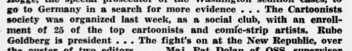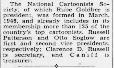 The Society was born at a specially convened dinner in New York in March, 1946, that saw Rube Goldberg elected as president, Russell Patterson as vice president, C.D. Russell as secretary and Milton Caniff as treasurer. A second vice president, Otto Soglow, was subsequently added. Within two weeks, the Society had 32 members…