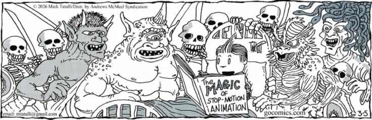 Enjoyed Mark Tatulli‘s tribute to Ray Harryhausen, the master of creating movie creatures in the mid-20th Century, which became TV fodder in my younger days.