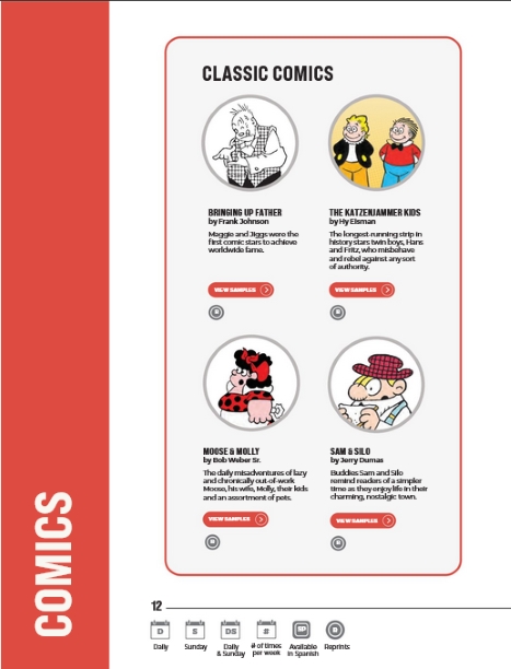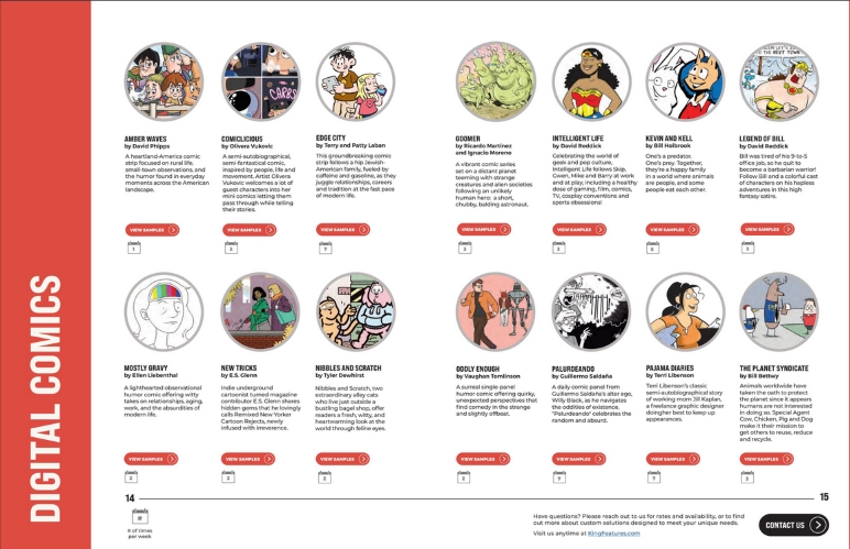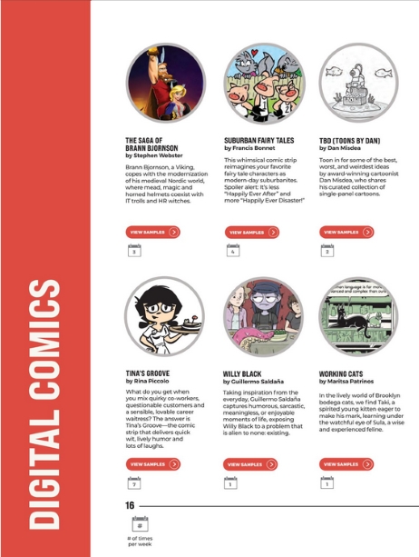 Twenty “digital” comics are listed, four more than last year. The additions are the above mentioned Tina’s Groove plus Mostly Gravy, Oddly Enough, and the King Features Weekly Service comic strip Amber Waves. Disappointingly The Directory doesn’t list the King Features Weekly Service comics or features. That link hasn’t been updated for years (a decade?). But I do know that Out on a Limb, The Spats, and Just Like Cats & Dogs still appear in weekly newspapers.