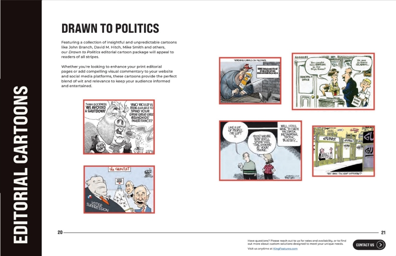 The Political Cartoonist page remains the same as last year minus the third paragraph list of the contributors. Those syndicated by KFS are John Branch, David M. Hitch, Lee Judge, Jimmy Margulies, Mike Smith, and Kirk Walters. Margulies remains on the King Features roster but is also on the Cagle Cartoons page (?!). Ed Gamble hasn’t shown up at Comics Kingdom since last Spring (I think we missed his quiet retiring).