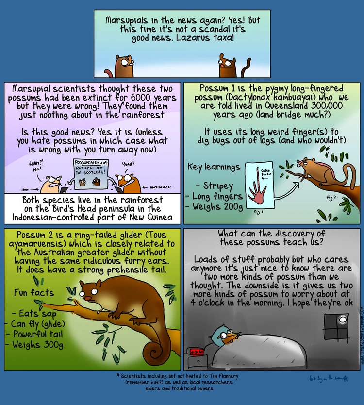 Going the opposite direction, here’s a pair of marsupials thought to have been extinct for several thousand years before Wordsworth went for a walk, though he’d have had to wander lonely all the way to New Guinea to have seen them anyway. And then tourists would have started releasing regular American possums there in a misguided tribute of some sort.