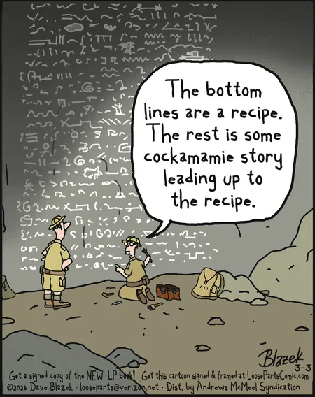 I understand that on-line recipes are trying to keep you engaged longer for financial reasons, though I’m not sure they wouldn’t do just as well selling you spices — which they also do — and I’ve noticed more and more of them including a “jump to recipe” button, which I would think defeats the purpose of that long cockamamie story.