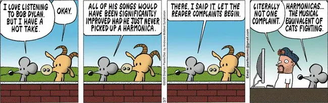 I’m certainly not as much against harmonicas as Rat, but he’s right: I can’t think of a Dylan song that was enhanced by his harmonica.