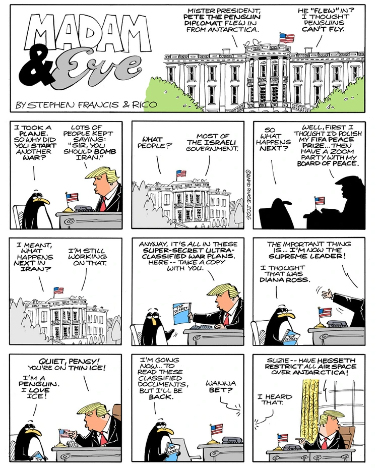 There aren’t any penguins in New Guinea, as far as I know, though I didn’t know there were extinct possums there, either. But Pete the Penguin was discovered in Antarctica about the time Dear Leader announced a tariff on them and he’s been assisting with international relations ever since.