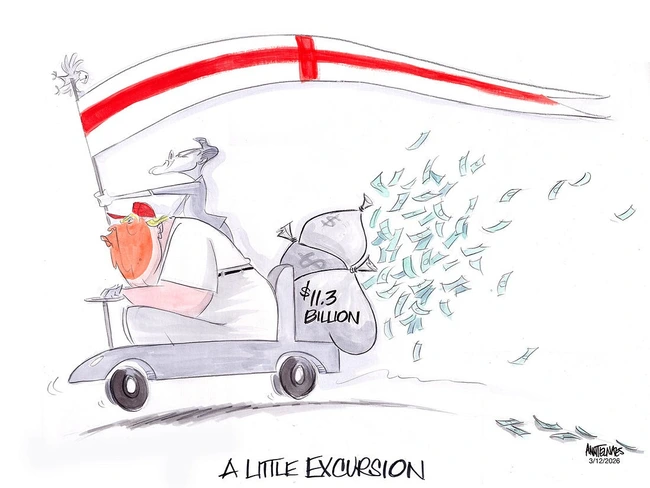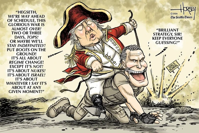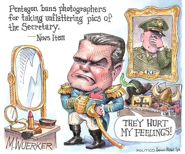 Wuerker responds by reminding us that truth is an affirmative defense to libel, and that Pete Hegseth seems, whether photographed or drawn by an artist, like Ted Baxter with guns and with a headful of greasy kids’ stuff.