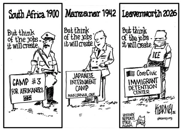 The wrongfully seized people, apparently charged with having brown skin and black hair and speaking with accents, remain in custody, though Vermont authorities have sought court orders forbidding them to be taken out of state and confined to the places that, for the past 125 years, have been called “concentration camps” but now have nicer names, though the accommodations are not as elegant as South Africa or Manzanar.