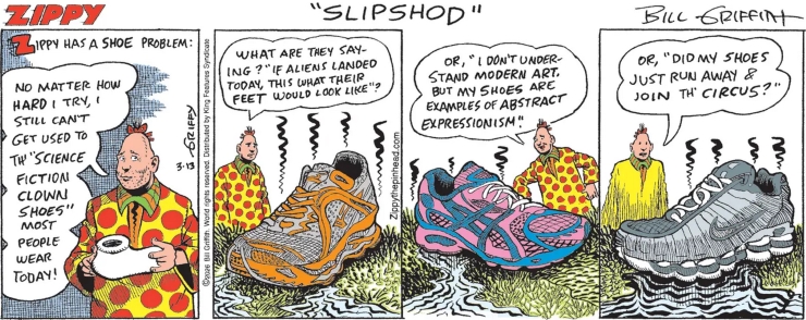 Are we having fun with theexecutive administration lickspittles wearing oversized shoes gifted by Trump? Today’s Zippy the Pinhead by Bill Griffith hit the newsstands at the right time.