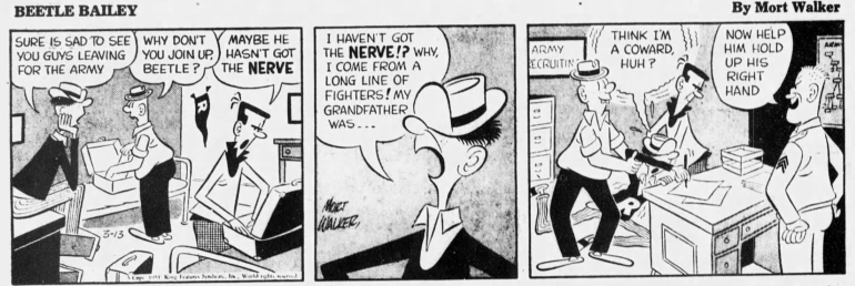 It was 75 years ago today that Beetle Bailey joined the U. S. Army, a decision that would change the direction of the strip if not the character. And send the comic strip to the top of newspaper circulation.