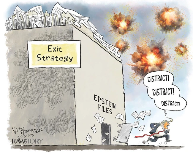 But Nick Anderson indicates the real motivation for the current war, and it’s not about oil, nor is it a sudden interest in human rights in Iran. It is a loud, dangerous distraction, and the real battle remains in unreleased documents and blacked-out names and missing pages.