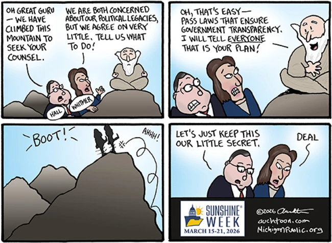 Nor should you wait for someone else to pick up the gauntlet. A few years ago, lots of newspapers marked Sunshine Week and many cartoonists created cartoons celebrating press freedom. This year, I found only John Auchter of Michigan Public Radio offering a cry for transparency.