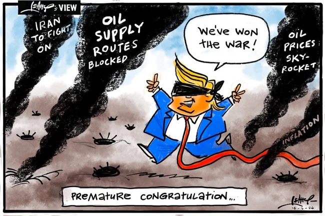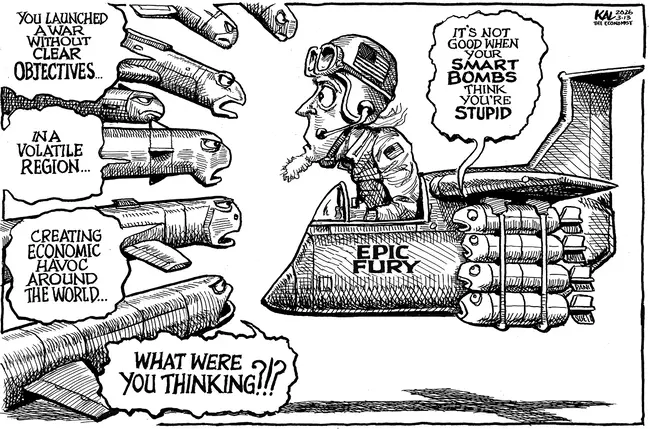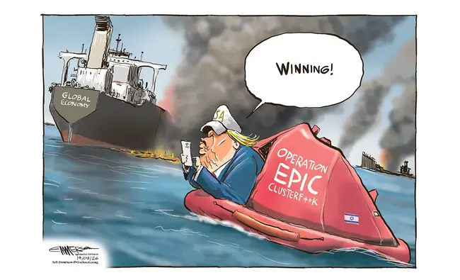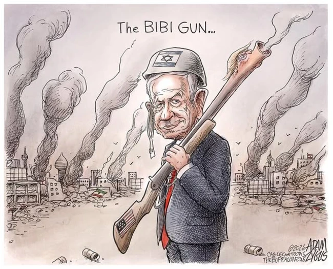 Adam Zyglis sums up both the role of Trump and Hegseth and the rear-echelon stature of Bibi Netanyahu, who seemingly had more to do with our entry into the war than did our own legislature.