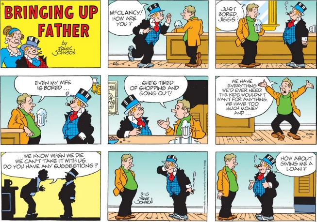 With the St. Pat’s holy day arriving soon was it unreasonable for me to expect the Bringing Up Father reprint for today to include a reference to corned beef and hash at Dinty Moore’s? And then I was confused about multi-million dollar lotto winner (or however he got his money) Jiggs asking for a loan.