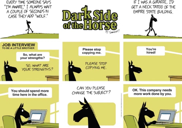 I am, on an ongoing basis, amazed (and more than a little jealous) of foreign (Finnish) cartoonist Samson‘s command of the English language. Today it was the first panel and last tier of Dark Side of the Horse. This also applies to Argentine born Liniers of Macanudo.
