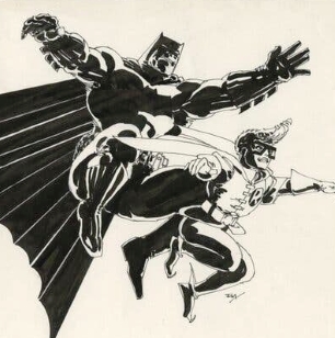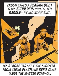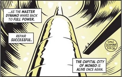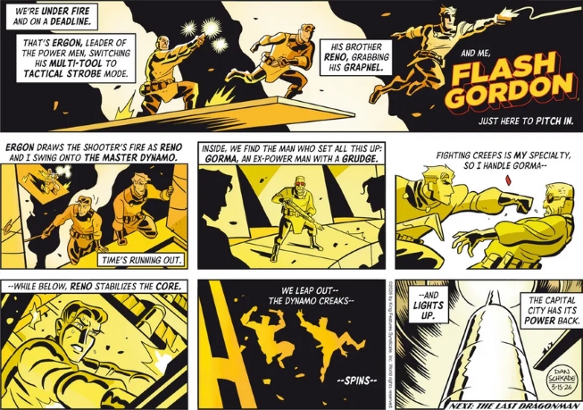 I was this many years old, after reading Dan Schkade’s Flash Gordon for two and a half years, before realizing that Schkade occasionally reworks panels from the dailies to use in his Sunday recaps. It came about accidentally as a panel from this past week reminded me of a Frank Miller Dark Knight illustration.