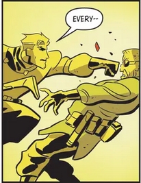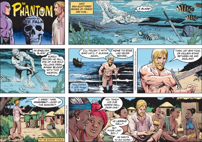 I admired the the subtle way DePaul and Weigel showed the passing of time since Christopher Walker had been stranded. Rather than the unimaginative “three months later” they show the skeletons of his compatriots who died in the attack by the Singh Brotherhood and that he is learning to speak the Bandar language.