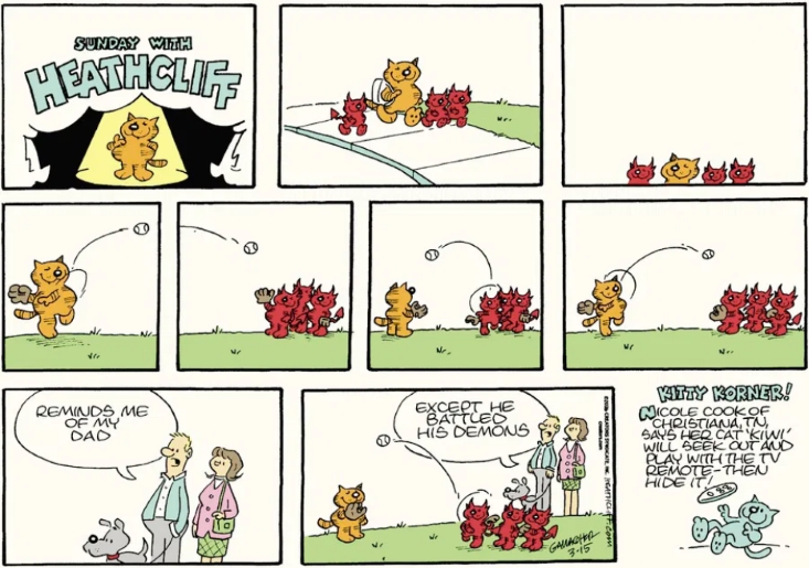 Heathcliff usually makes about as much sense to me as does Zippy the Pinhead. But today there was actually a gag that was funny to me and appropriate for the character.