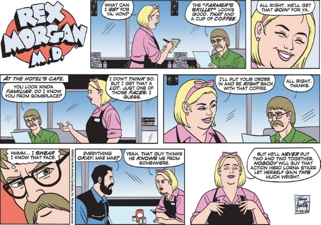 Subscribers to Comics Kingdom (free seven day trial now) got their first look at guest ghost artist Mimi Simon on Rex Morgan, M.D. today. She got a good line going and while obviously not Terry Beatty she keeps a close approximation so regular readers, not us comics fanatics, will not be upset about the change in the look of the strip.