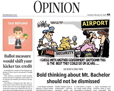 The Bend Bulletin had been selecting cartoons from the Tribune Content Agency – the last ones were by Nick Anderson, Bill Bramhall, Phil Hands, David Horsey, Jack Ohman, Joel Pett, Drew Sheneman, and Joey Weatherford. The last edition that carried an editorial cartoon was the February 22, 2026 issue. I can find no mention of the paper discontinuing political carts though there is no doubt they have.