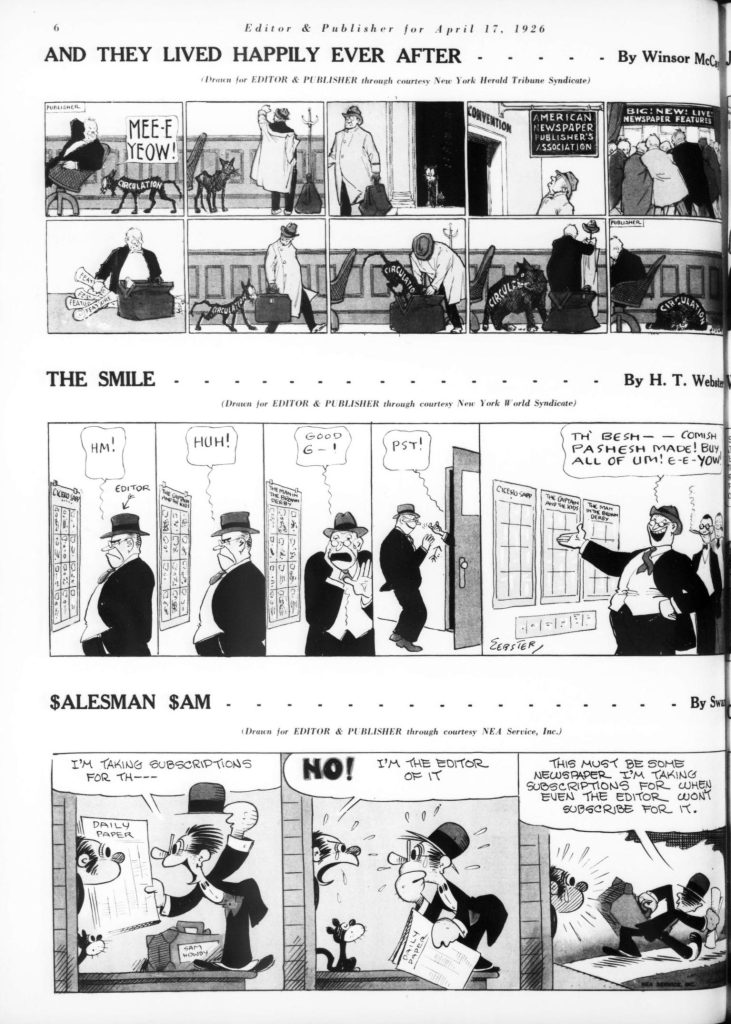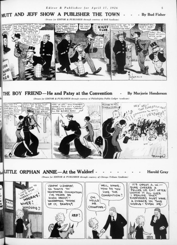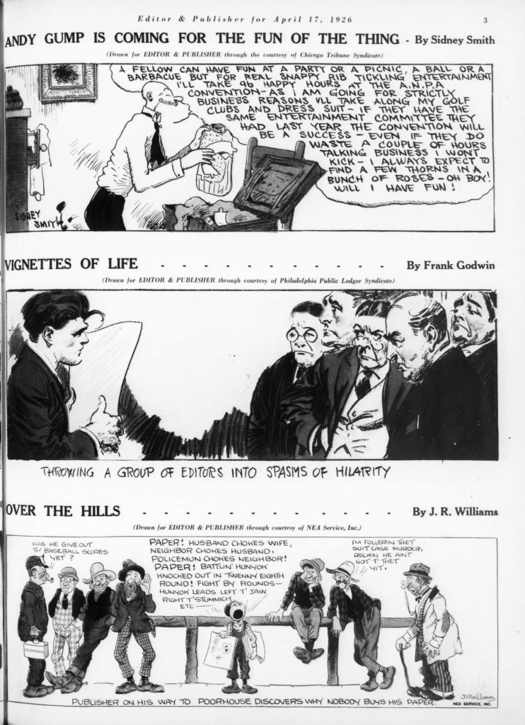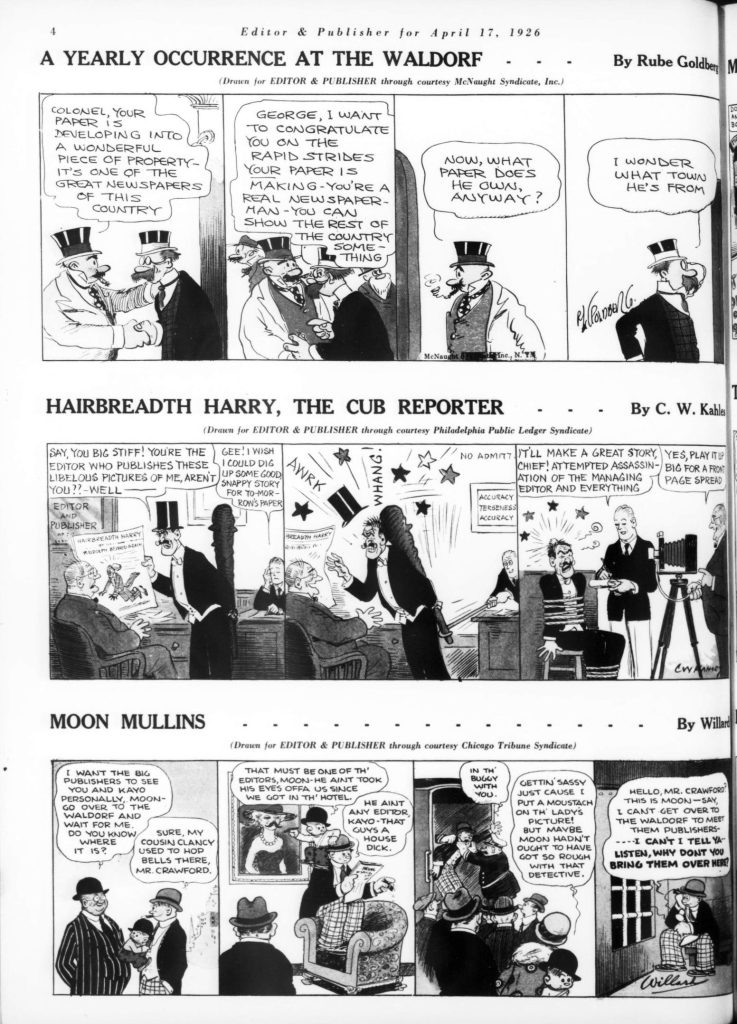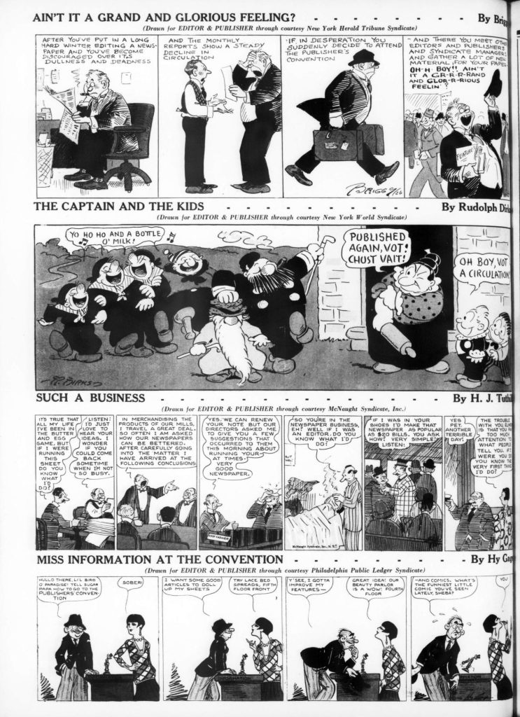 Skip to commentsOn April 17, 1926 Editor and Publisher celebrated the 32nd anniversary of newspaper comics with a comic supplement featuring specially created comic strips for the 1926 Newspaper Convention. The contributing cartoonist were Edward Grinham, Merrill Blosser, Burt Thomas, Frank King, Sidney Smith, Frank Godwin, J. R. Williams, Rube Goldberg, C. W. Kahles, Frank Willard, Bud Fisher, Marjorie Henderson, Harold Gray, Winsor McCay, H. T. Webster, George Swanson, Gene Carr, Martin Branner, Fred Locher, Clare Briggs, Rudolph Dirks, H. J. Tuthill, andHy Gage.