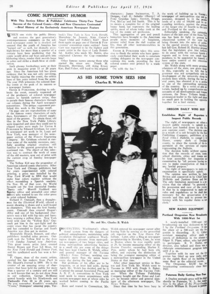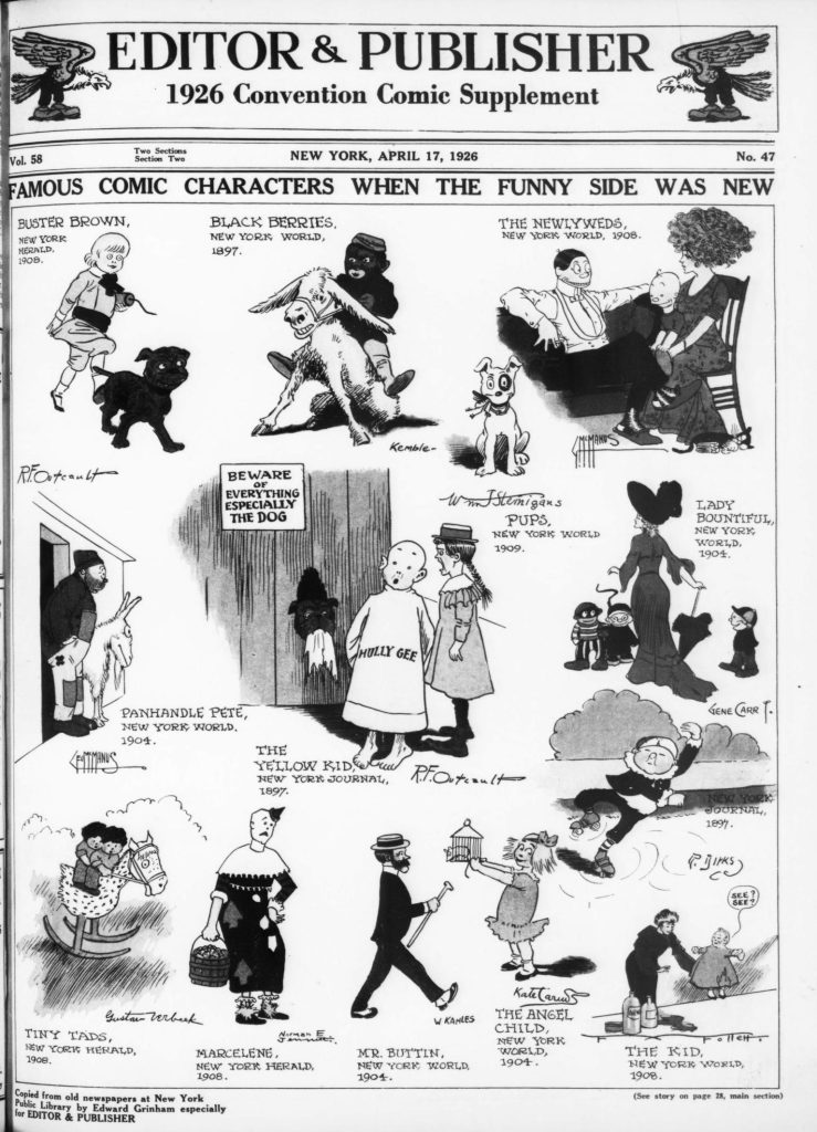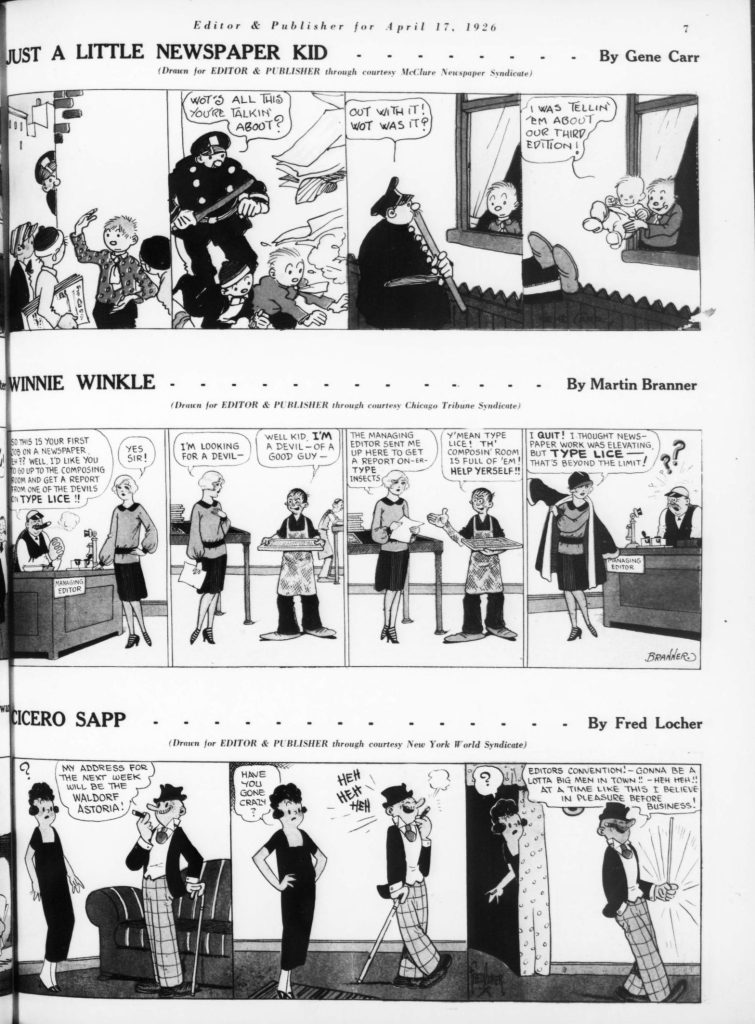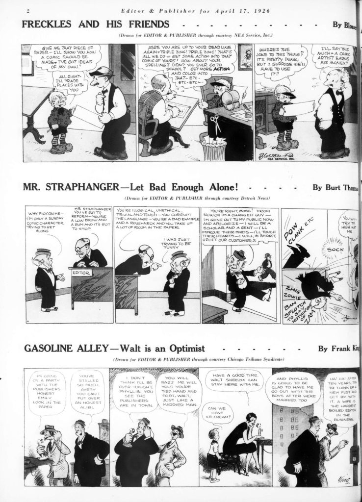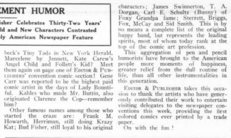 Skip to commentsOn April 17, 1926 Editor and Publisher celebrated the 32nd anniversary of newspaper comics with a comic supplement featuring specially created comic strips for the 1926 Newspaper Convention. The contributing cartoonist were Edward Grinham, Merrill Blosser, Burt Thomas, Frank King, Sidney Smith, Frank Godwin, J. R. Williams, Rube Goldberg, C. W. Kahles, Frank Willard, Bud Fisher, Marjorie Henderson, Harold Gray, Winsor McCay, H. T. Webster, George Swanson, Gene Carr, Martin Branner, Fred Locher, Clare Briggs, Rudolph Dirks, H. J. Tuthill, andHy Gage.