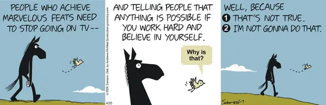Horse is right. All that “following your dreams” and “believing in yourself” is a load of hooey. Not that you shouldn’t do those things, but when someone gets up to accept an Oscar or Grammy or whatever, they give that advice and we’re supposed to forget that thousands of other people have followed their dreams and believed in themselves and are watching the award show on TV instead of appearing on it.