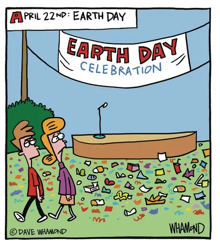 I don’t think it’s as grim a letdown as Whamond suggests, and this cartoon reminds me of a similar photo that anti-environmentalists circulated, which turned out to be phony: The litter was real but the event at which it had happened had nothing to do with Earth Day.