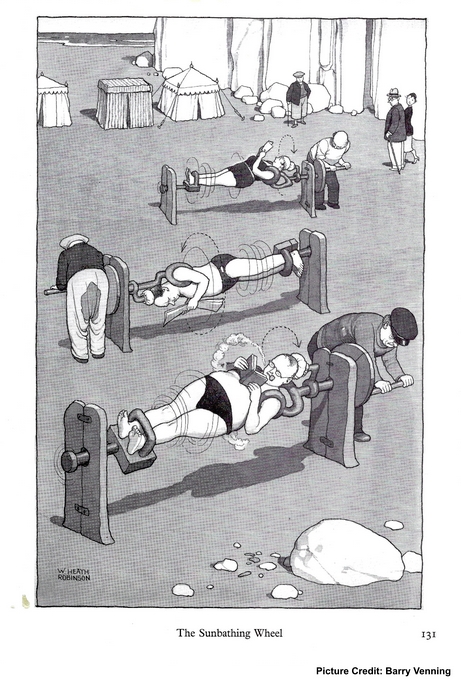 Today, the legend of Heath Robinson lives on with a large modern day following of artists, writers, architects and film makers including Nick Park of Wallace & Gromit, Philip Pullman and Thomas Heatherwick. Indeed, the delightful homage is cleverly reinvented in “The Wrong Trousers” of Wallace & Gromit! Heath Robinson’s “inventions” are prolific, but who can forget “The Multi-Movement Cat Silencer”, “The Sun Bathing Wheel” or “The Wart Chair”?