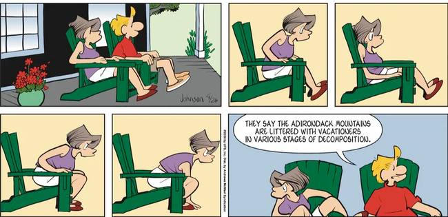 A little more regional humor: I should feel protective of Adirondack chairs, but as much as I want to support the old homestead, I’ve never found them all that comfortable, and, yes, they’re nearly impossible to get out of, even when you’re young and spry, never mind now.